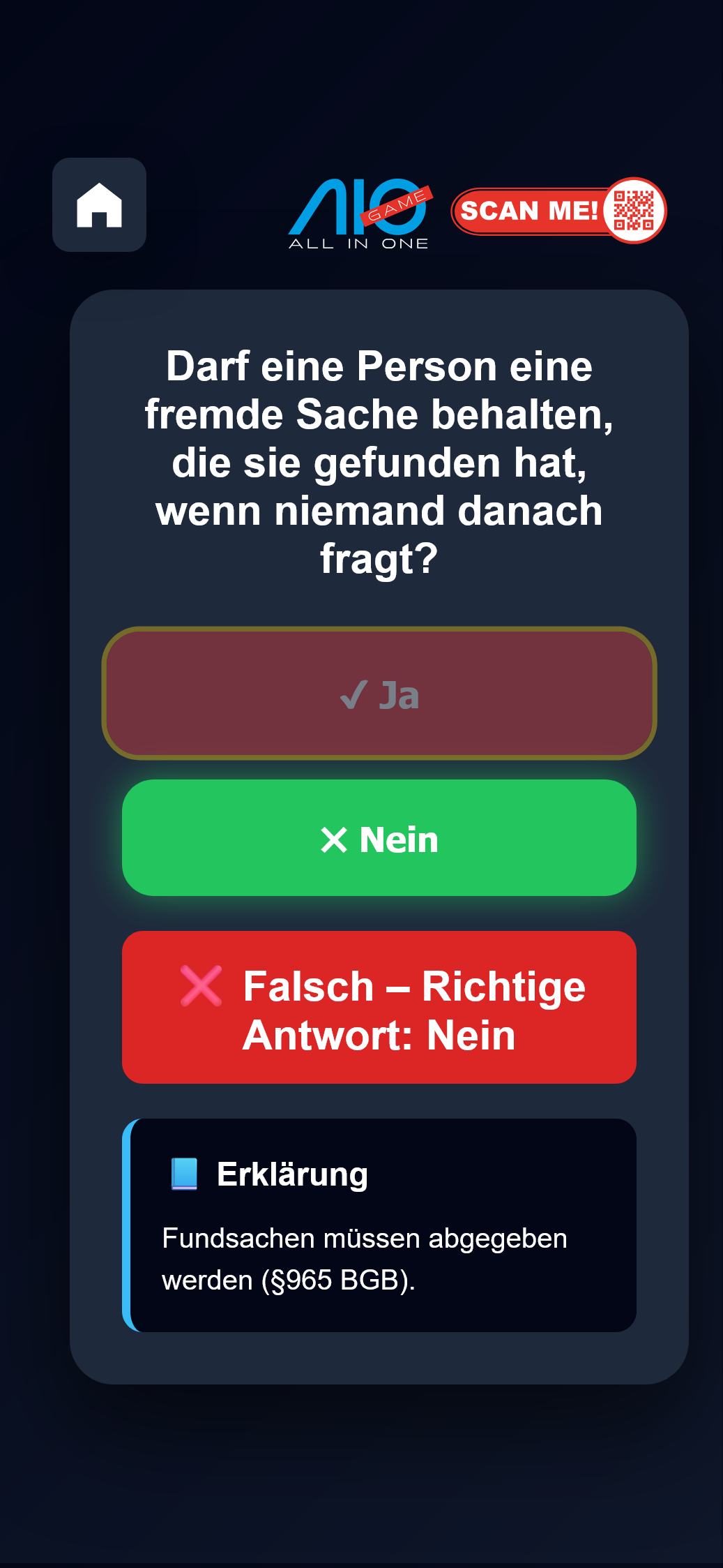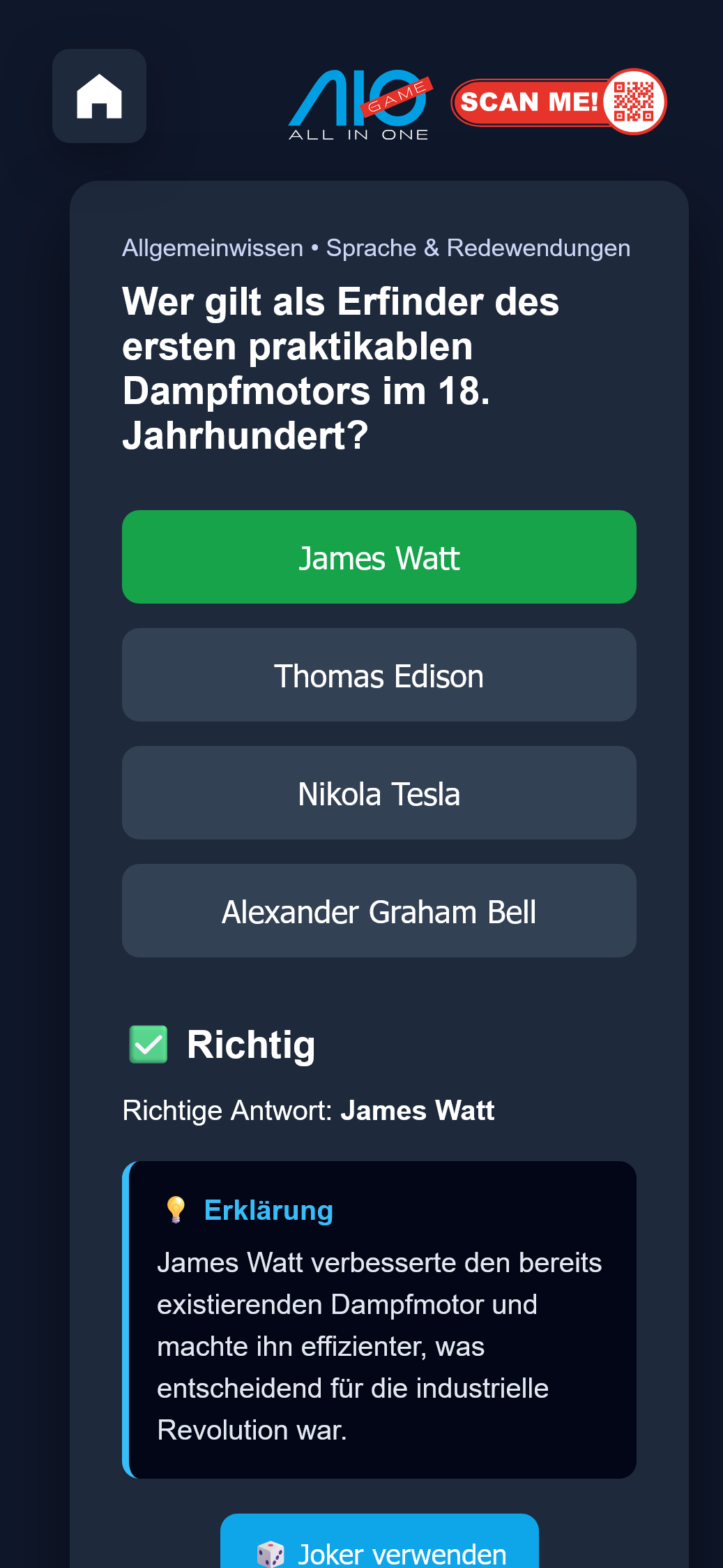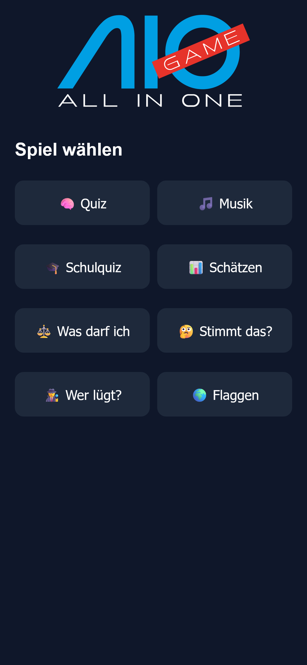 Einfach QR-Code scannen, Browser öffnen und loslegen. Wähle aus Quizspielen, Wahrheit und Pflicht oder unseren bald verfügbaren Partyspielen.